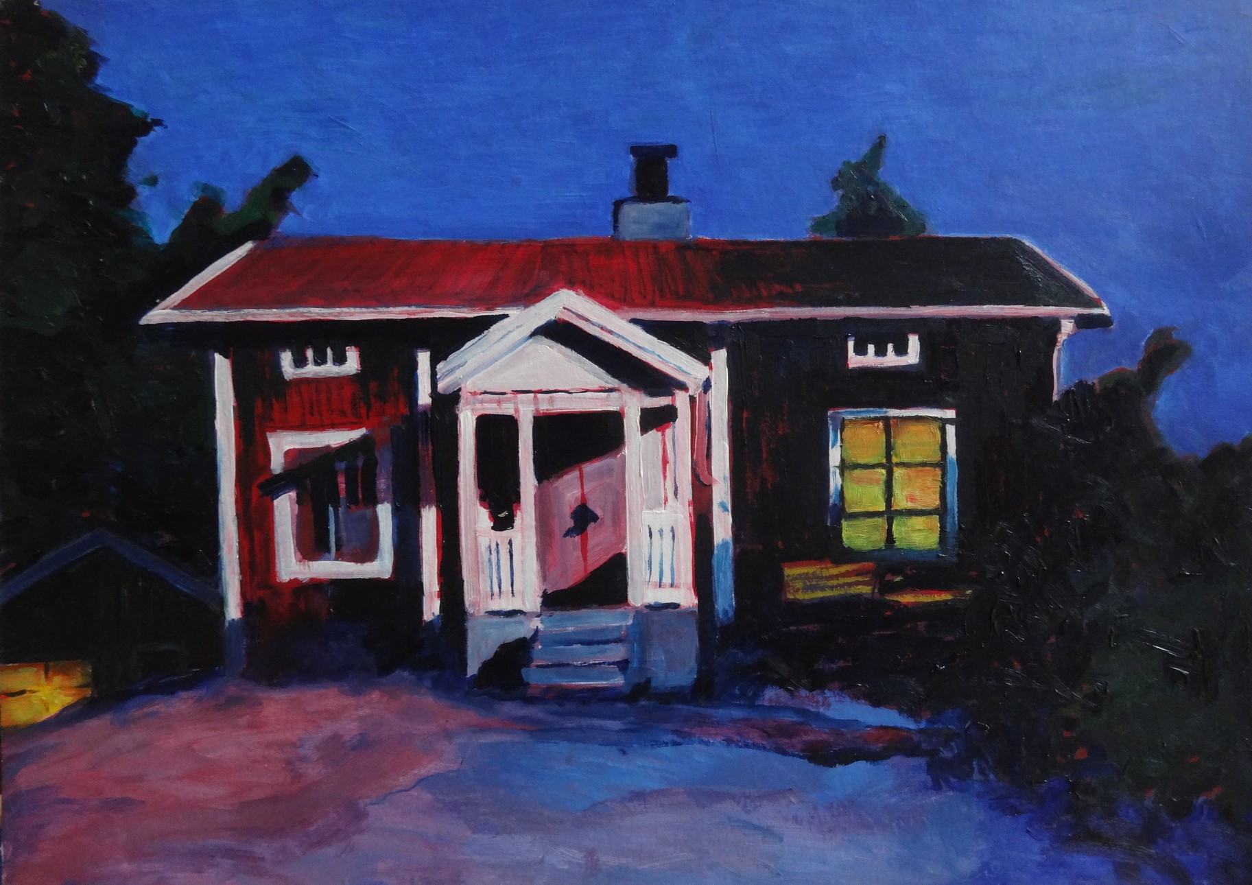 - Red and white cottage under a full moon, Sweden | acrylic on paper | 50x70cm | 1998